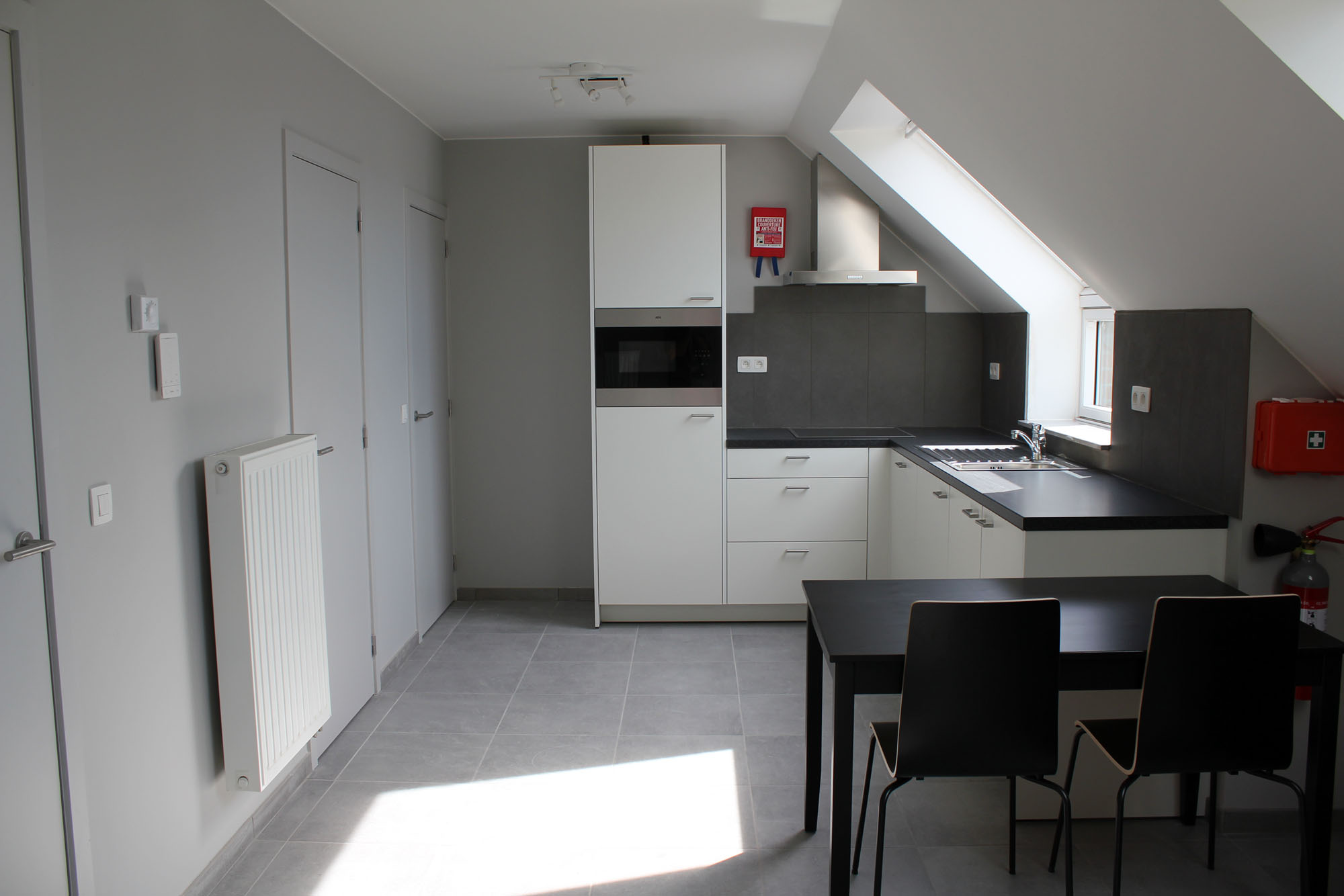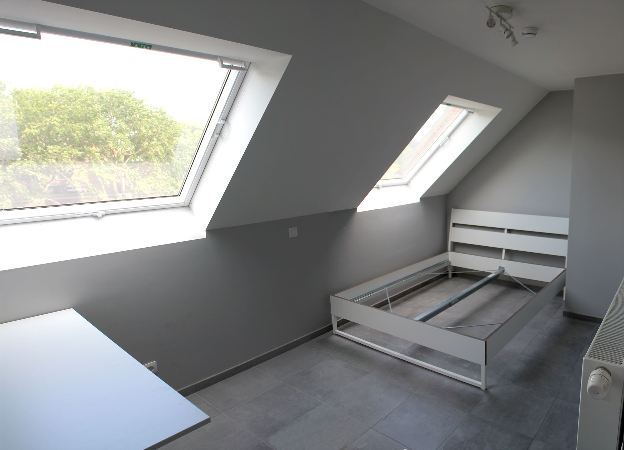 | Aparte slaapkamer met dubbel bed en bureau (verstelbaar in hoogte) |